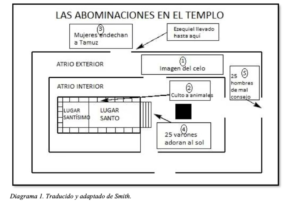 ¿Cuáles son las abominaciones? Lean el capítulo 8 de Ezequiel. ¿Y cuál es el capítulo 8? ¿Qué dice? Había una imagen en la entrada del templo, una imagen de Asera. Había 25 varones que se estaban postrando al nacimiento del sol. Había mujeres que estaban endechando a Tamuz. Había ancianos que estaban ofreciendo inciensos y oraciones a las serpientes y reptiles que habían pintado dentro del templo. Esas son las abominaciones.