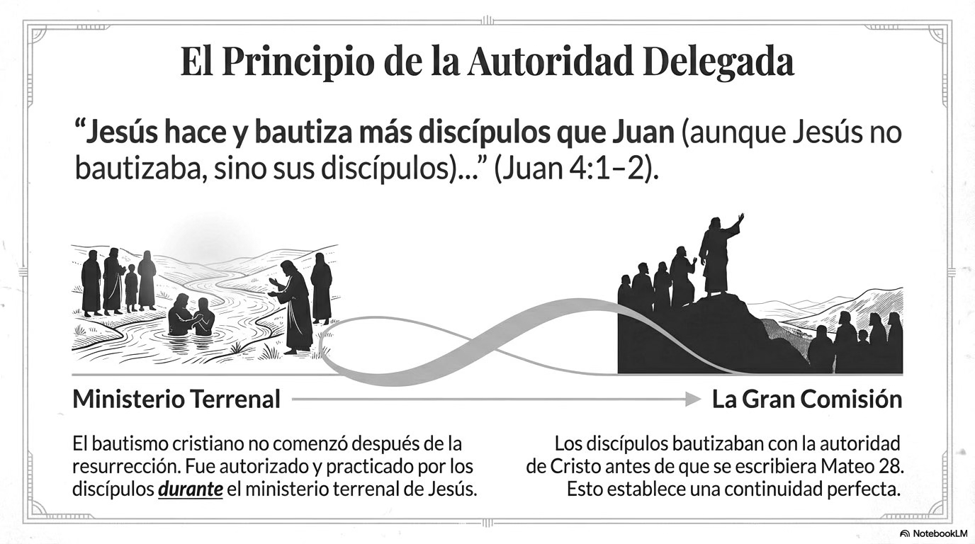 Este principio se aclara al observar el desarrollo del evangelio de Juan. En el capítulo 3 se afirma que Jesús llegó con sus discípulos a un lugar donde se bautizaba, y el énfasis en que había muchas aguas muestra que el bautismo era por inmersión. Sin embargo, al entrar al capítulo 4, el evangelista añade una aclaración decisiva: “aunque Jesús no bautizaba, sino sus discípulos” (Juan 4:2). Esto indica que los discípulos bautizaban por mandato y autoridad de Cristo, de tal manera que era correcto decir que Jesús bautizaba a través de ellos.